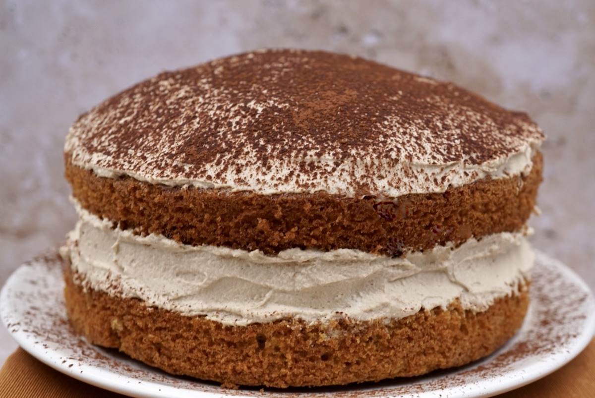 Espresso cake is a moist coffee Victoria sponge filled and topped with a silky mascarpone cream and finished with a dusting of cocoa powder. It is a simple and elegant coffee cake which pairs perfectly with a cup of tea or coffee.